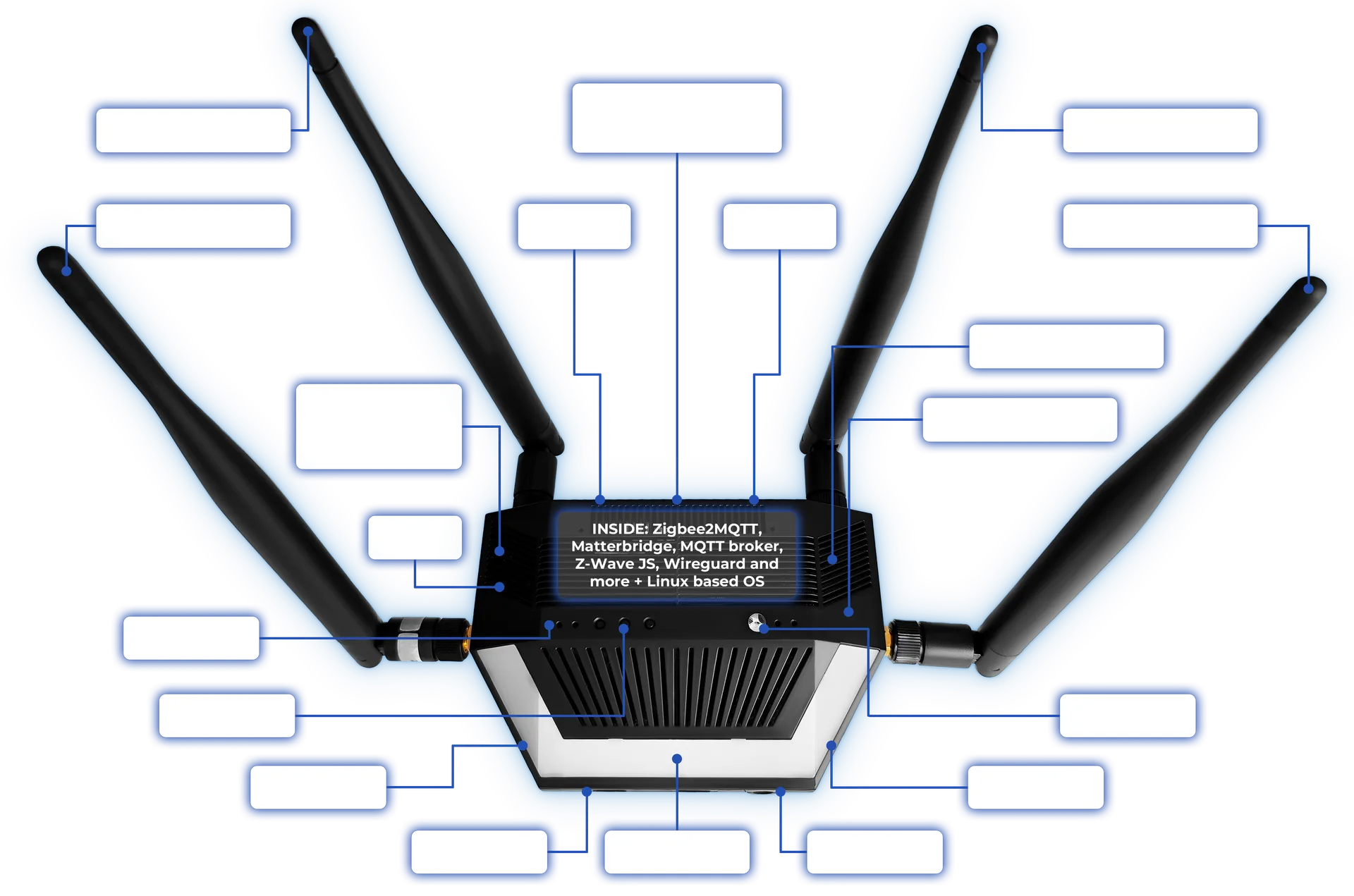 Optional external modules: 4G data, Z-Wave, PoE or custom via UART or USB.