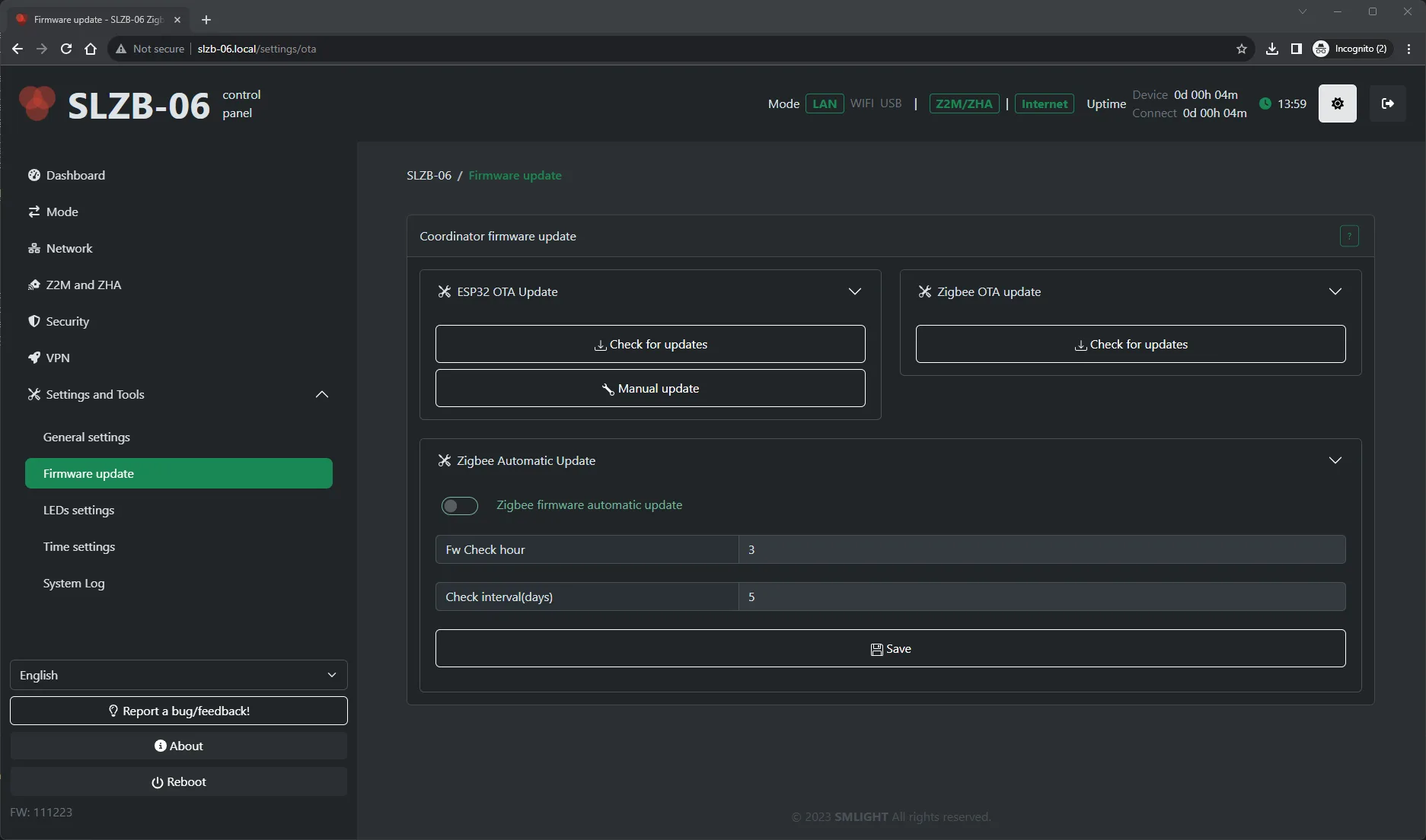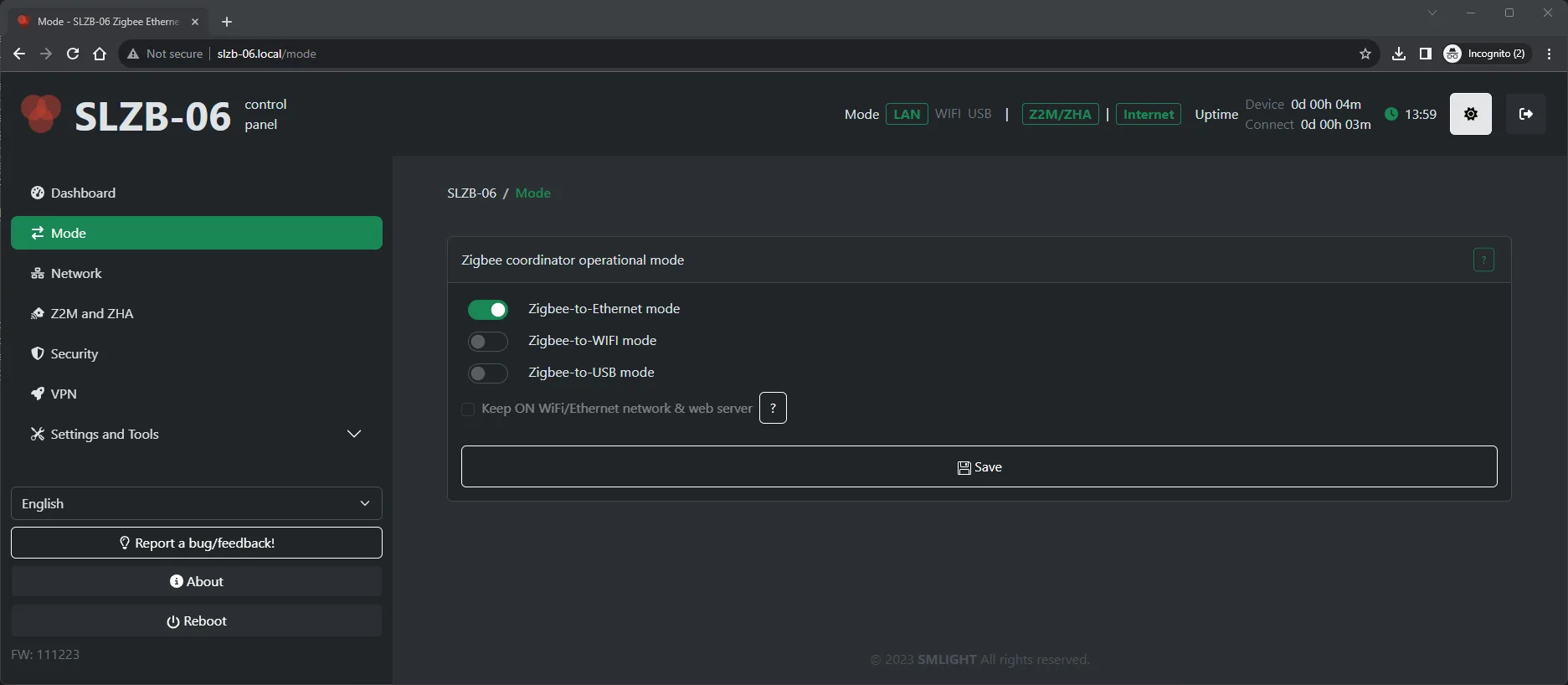 The SLZB-06/06M adapter can be configured either via a physical button or via the web interface.