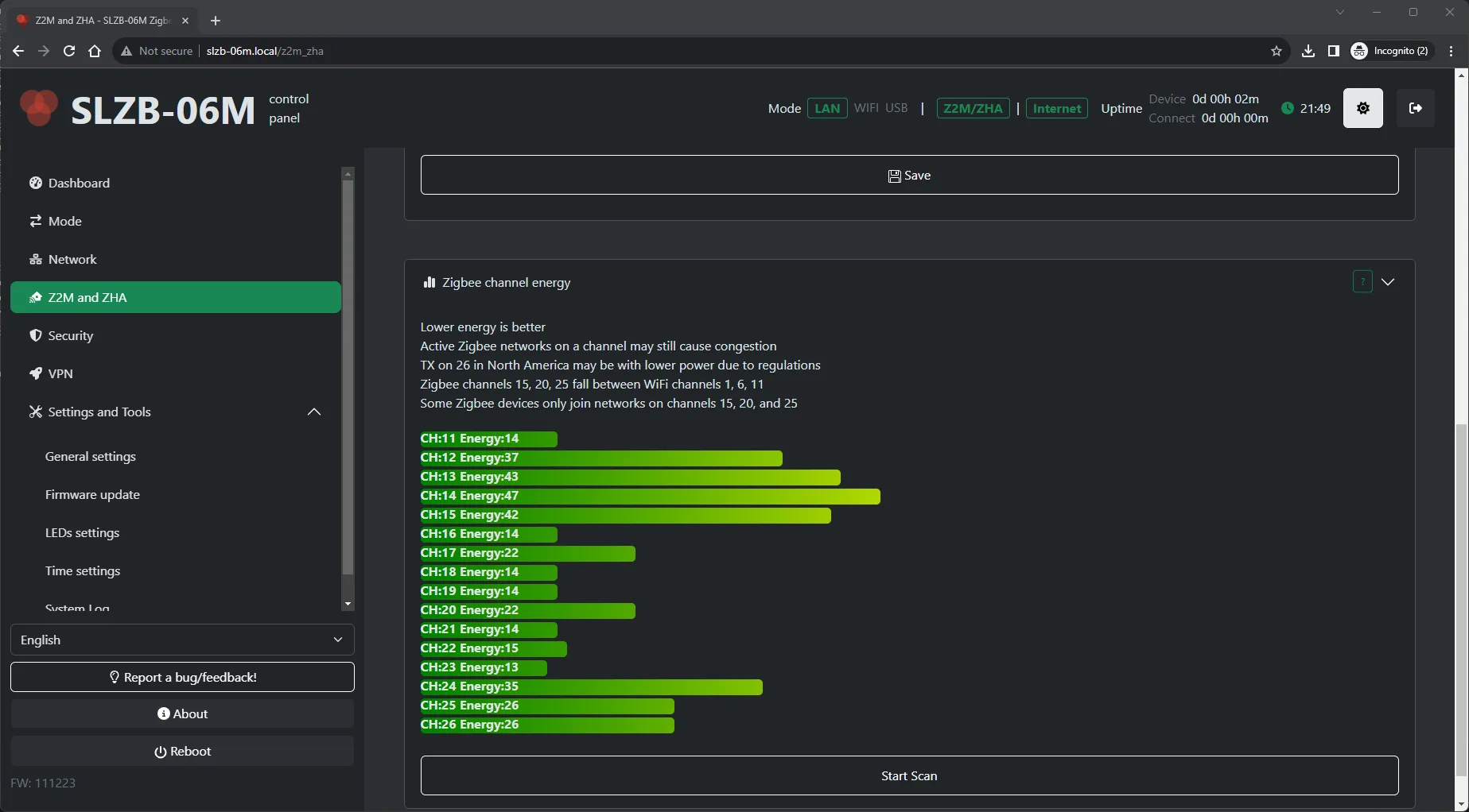 option for Zigbee channel scan.