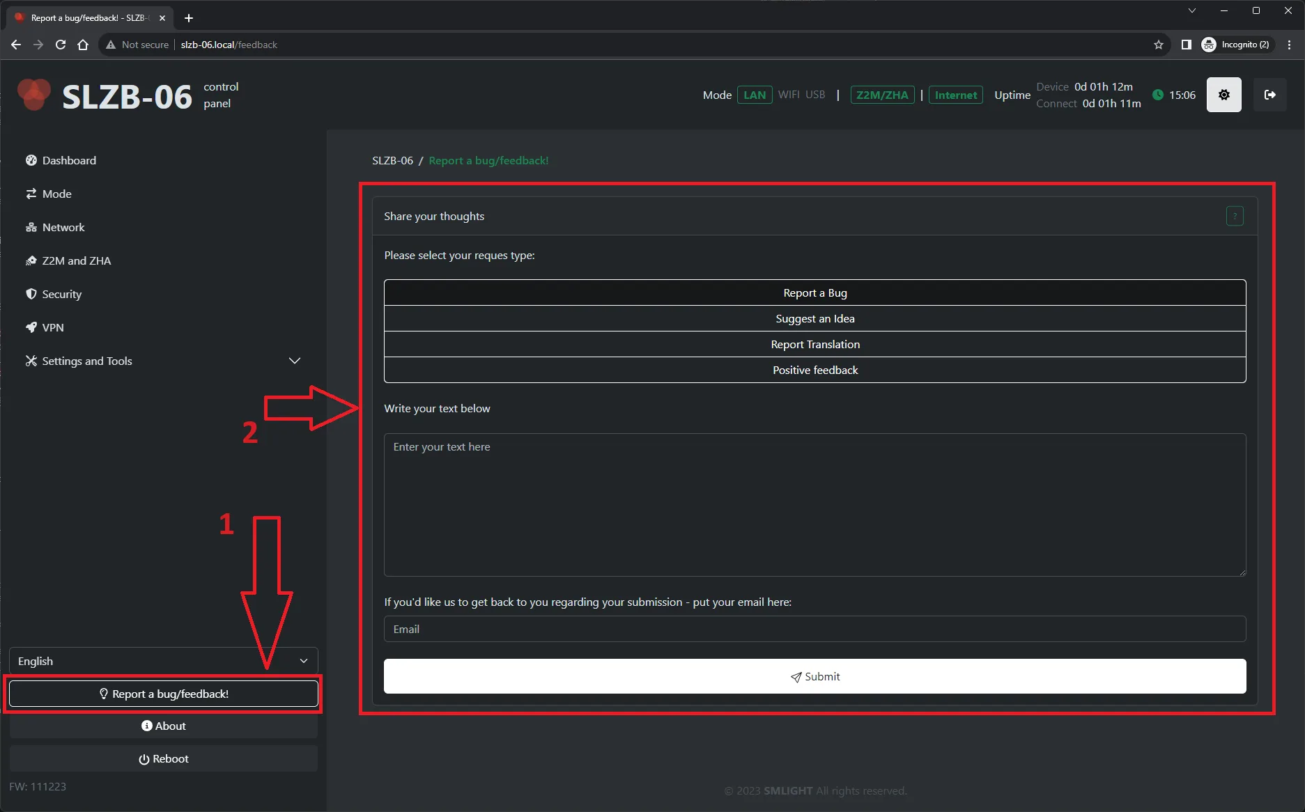 Submitting feedbacks OTA from SLZB-06/06M web interface