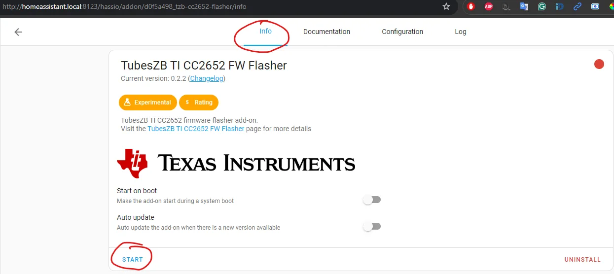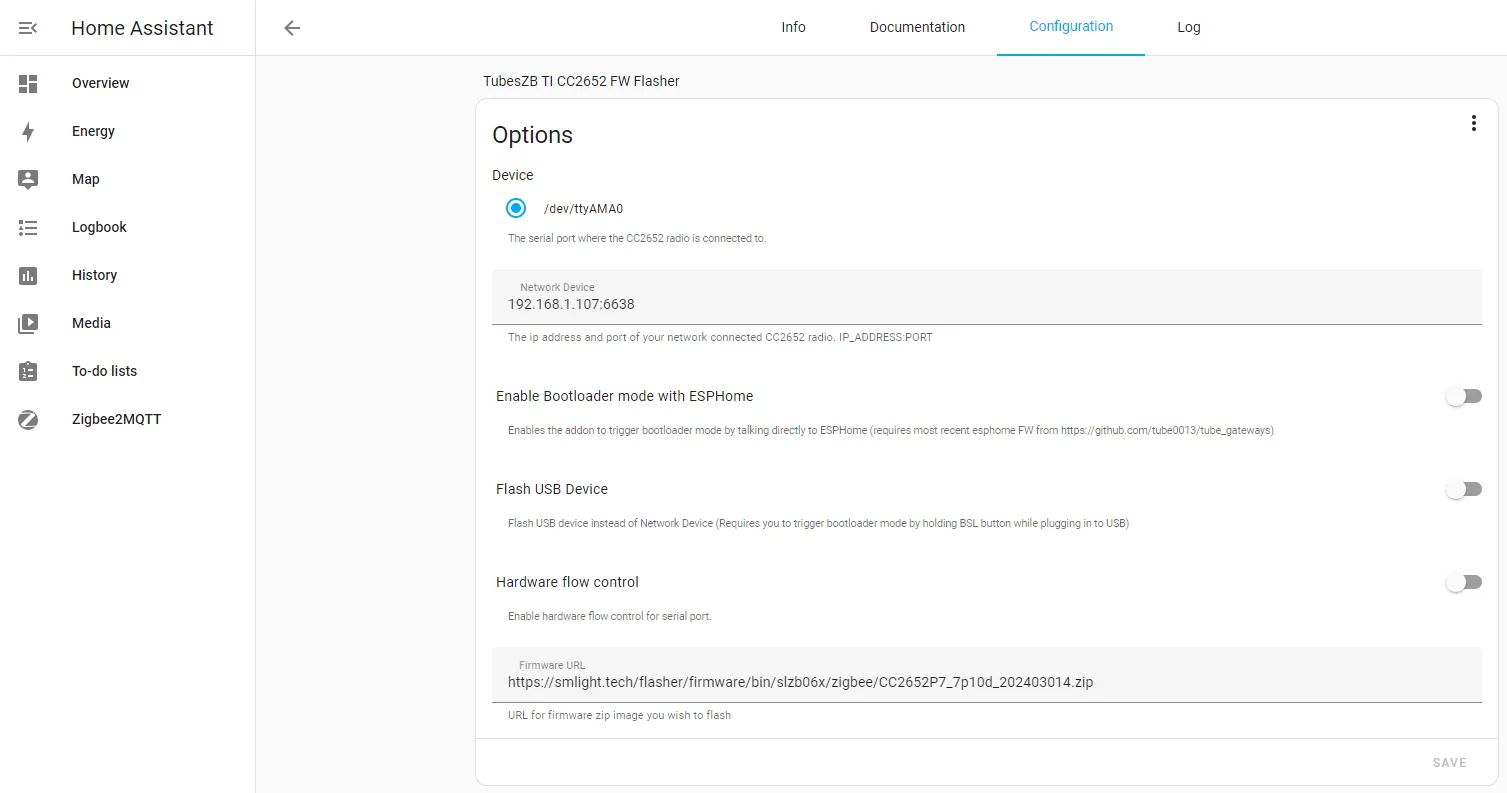 - Go to your Home Assistant -> Settings -> Add-ons -> "TubesZB TI CC2652 FW Flasher". Lets set it up: