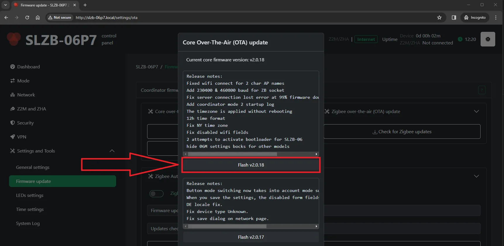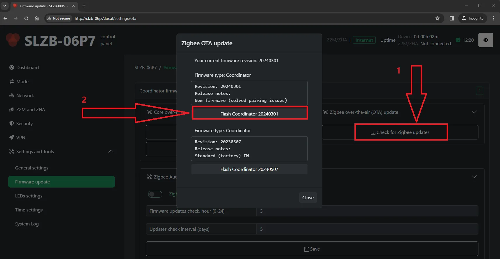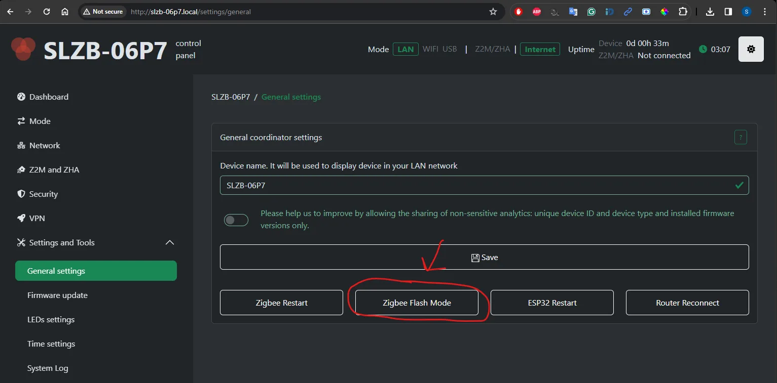 - Conect your device to your LAN network and go to the web interface (IP address or http://slzb-06p7.local/ if you have mdns set up)