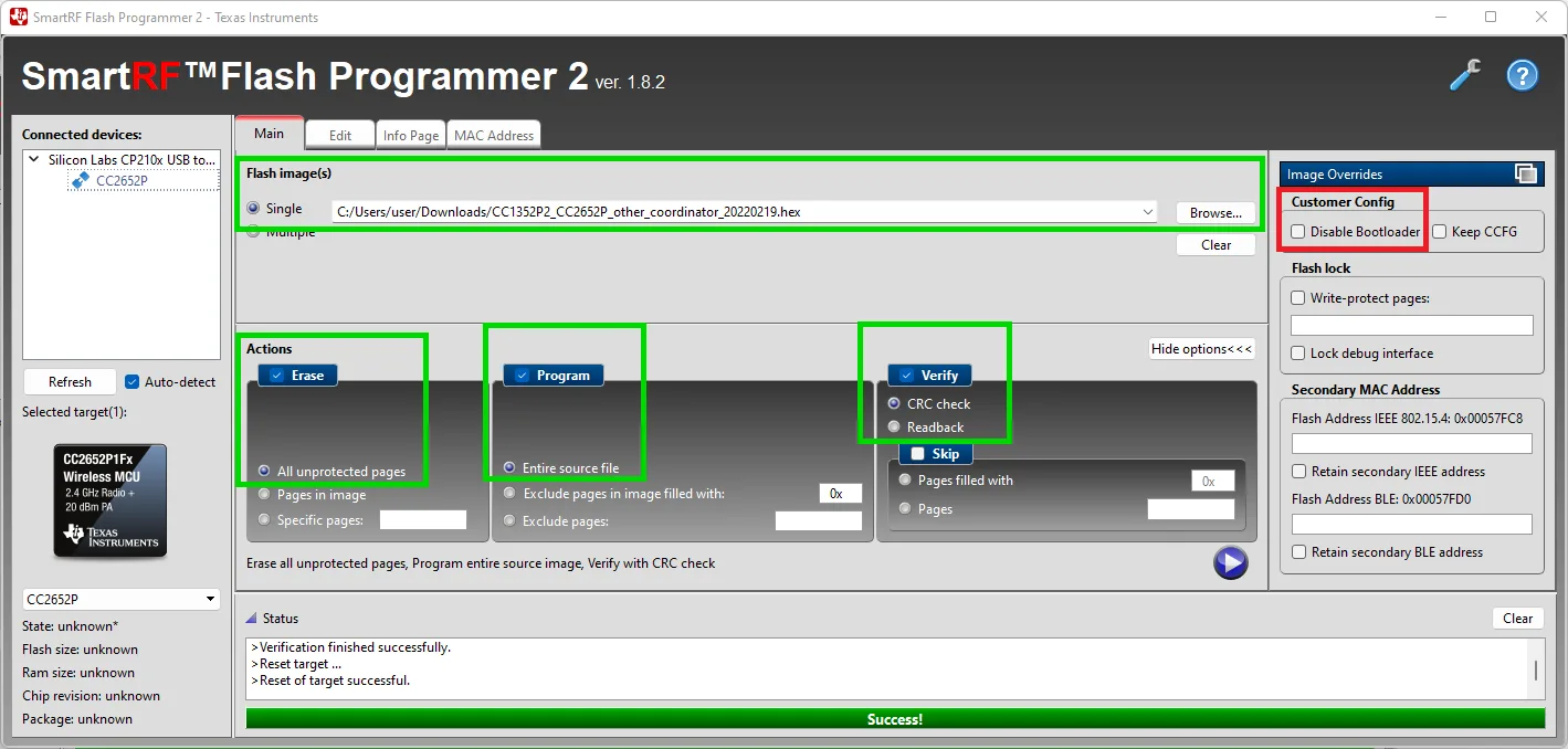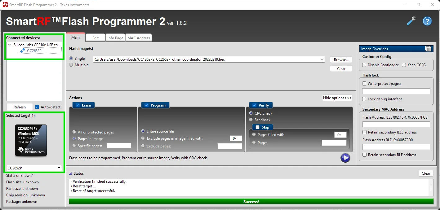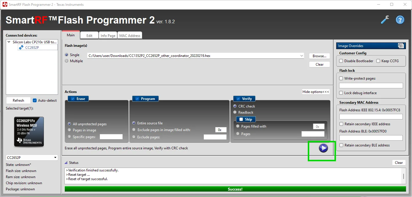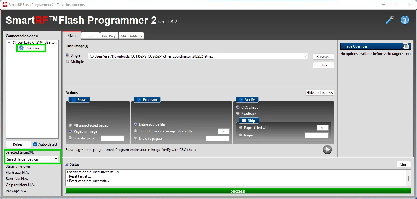 Success!is apeared at the progressbar and Status window statesReset of target successful. Flashing takes about 3 seconds;