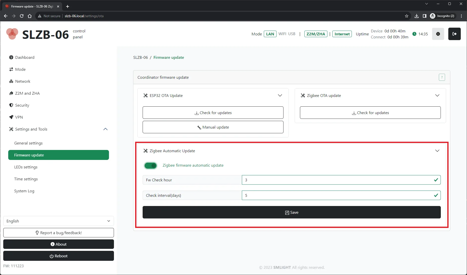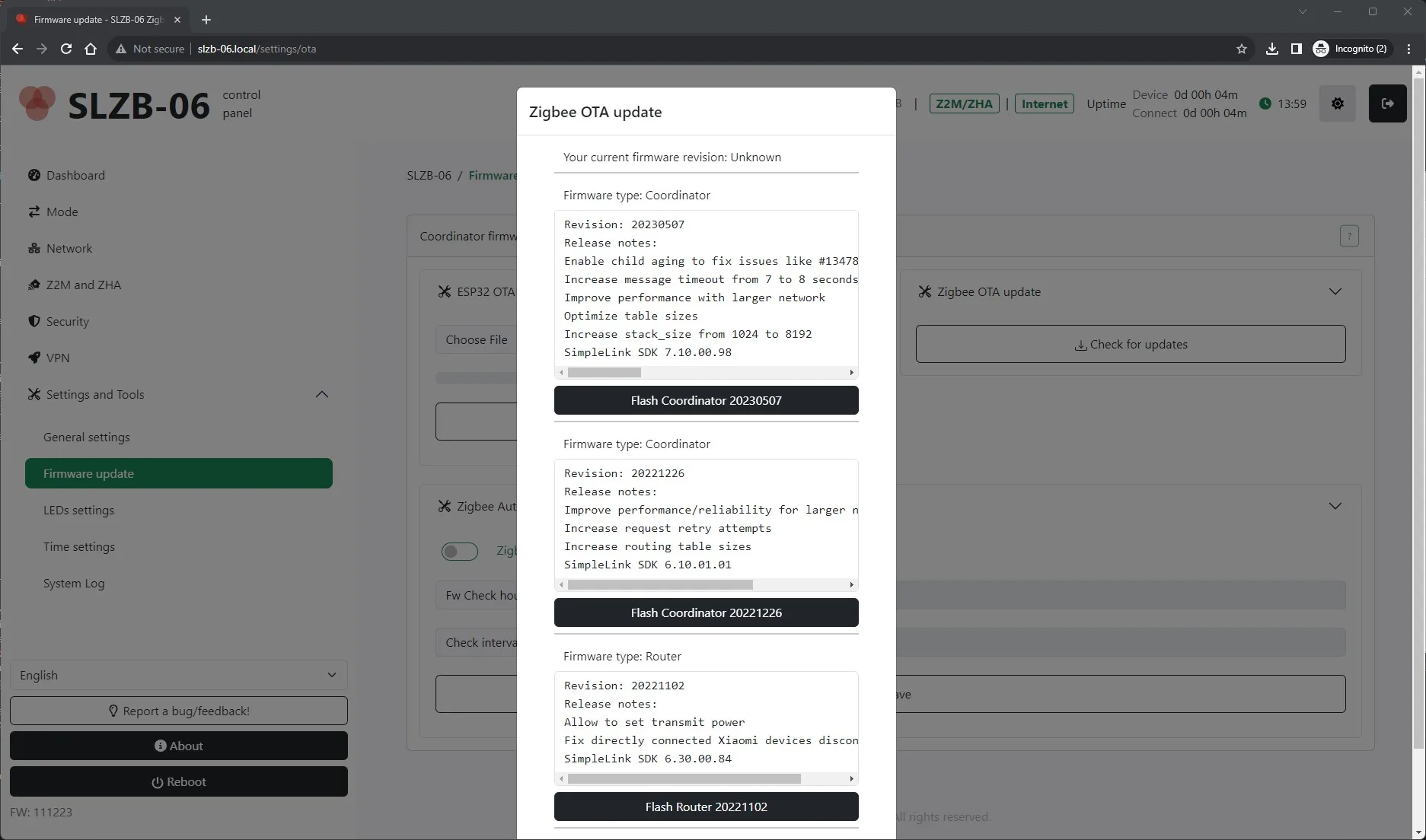 - Go to "Settings and Tools" -> "Firmware update" -> "Zigbee OTA Update" -> "Check for updates".
