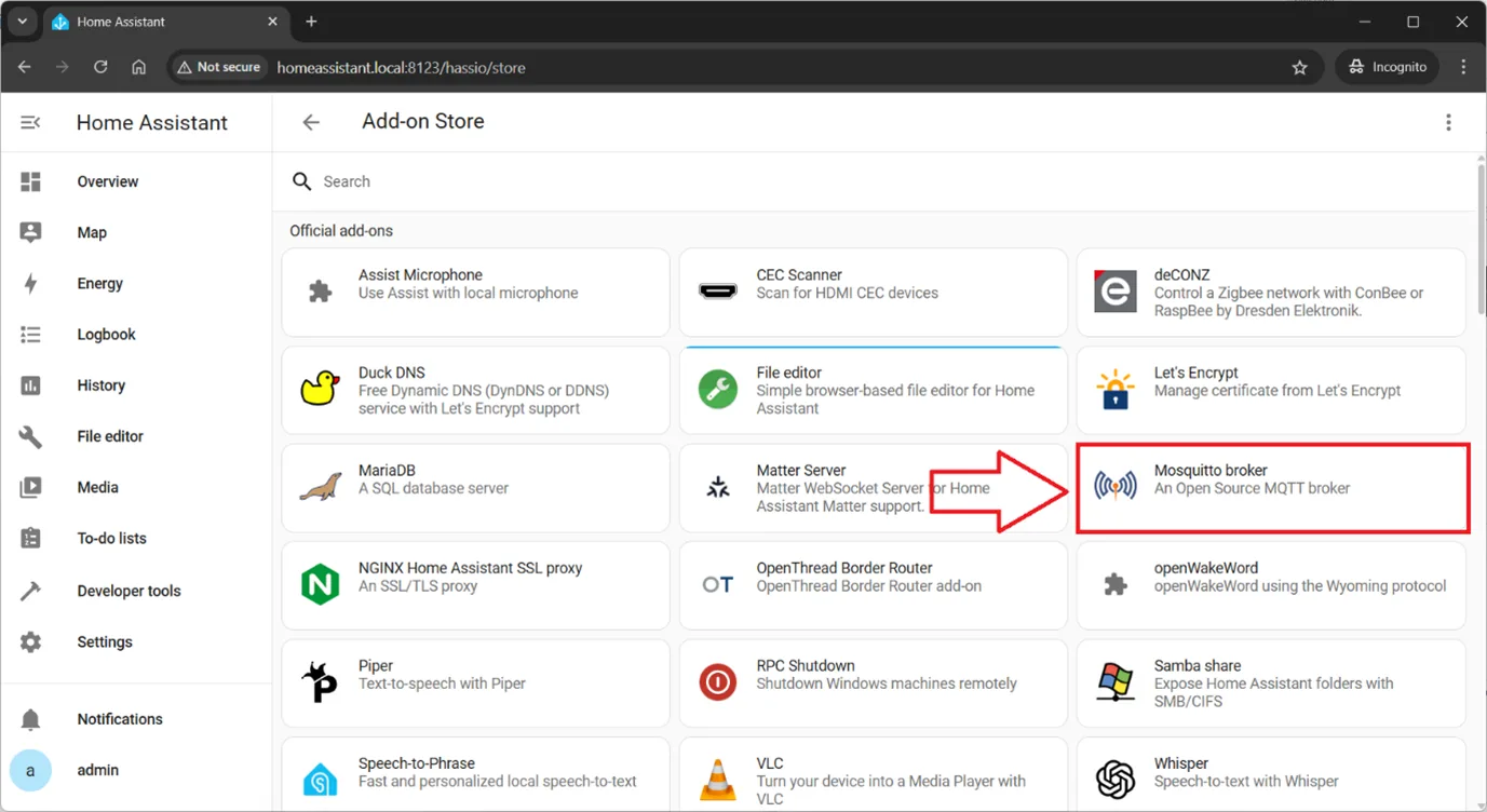 Settings->Add-onsand clickMosquitto broker(if you do not see Mosquitto add-on on the start screen - please use search); -