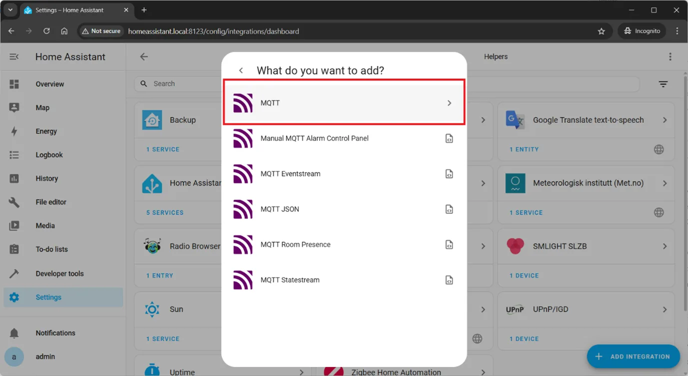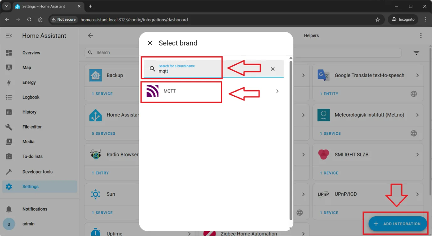 Settings–>Devices & Servicesand click button at the left bottom corner+ Add integration. Input in the search tab mqtt and click onMQTTsearch result.