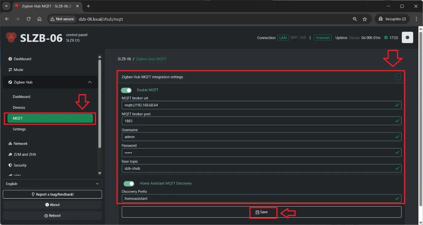 Go to SLZB-06x web interface, tab