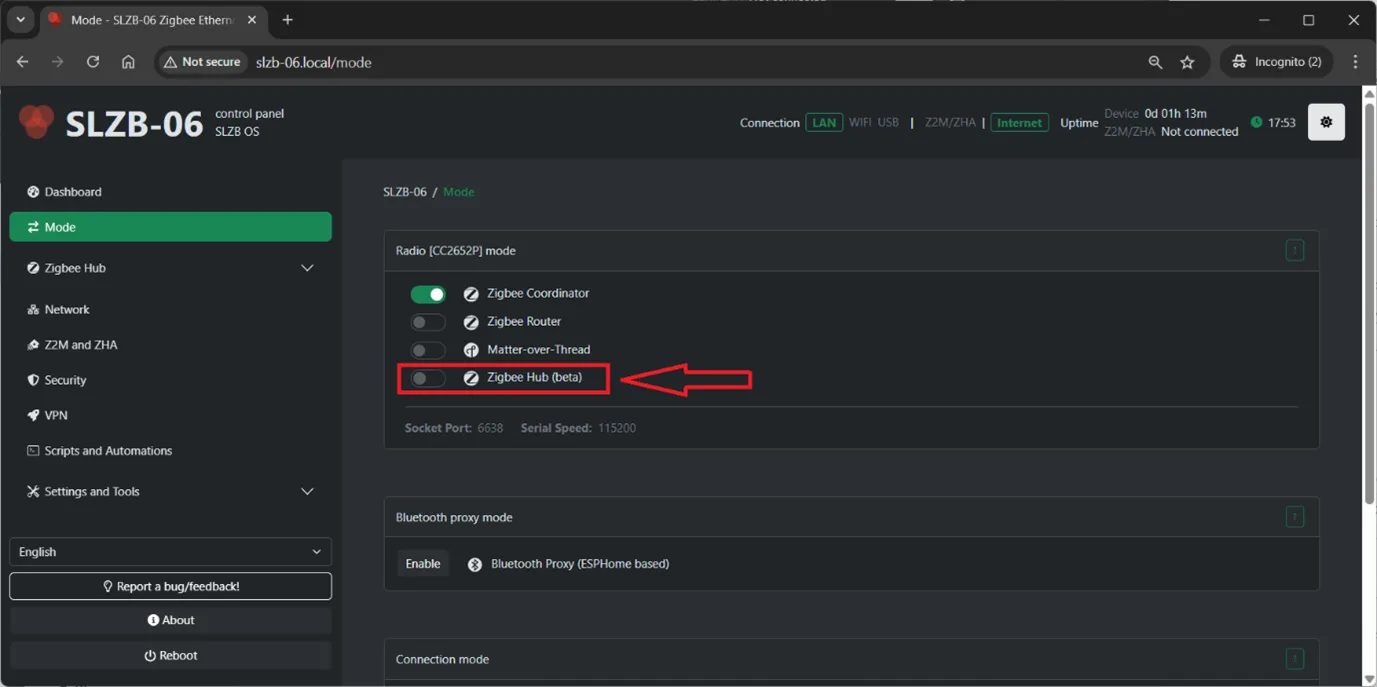 - zHub mode is available only on Texas Instrument radio SoC family CC26XX, this works on SLZB-06, SLZB-06p7 and SLZB-06p10 Zigbee coordinators.