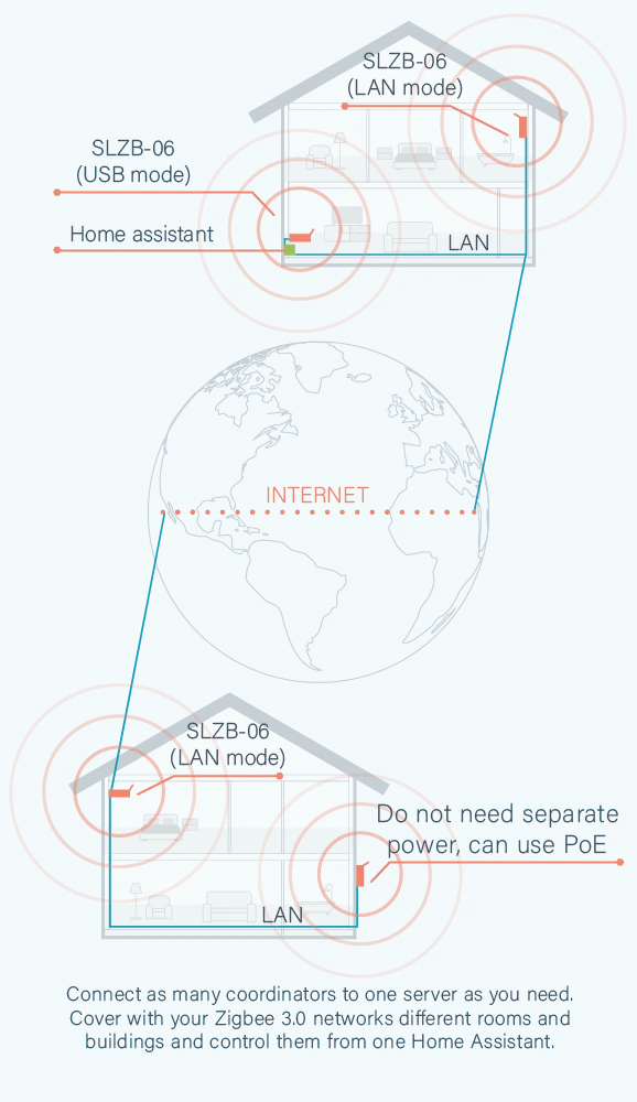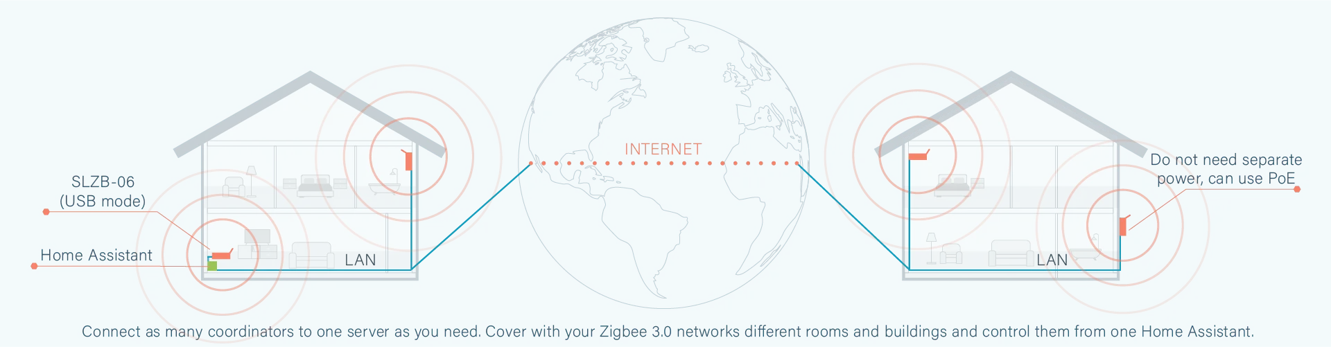 Yes, you can. You can set up as many SLZB-06 coordinators as you want with one Home Assistant. For that, you just need to run a separate instance of Zigbee2MQTT for each coordinator. We have now received feedback from our lovely Customers about using 6 items with one Home Assistant. Please also note that you can connect to devices that are outside your LAN network, e.g., somewhere in another location with access to the internet. More details can be found in this Article of the official manual.