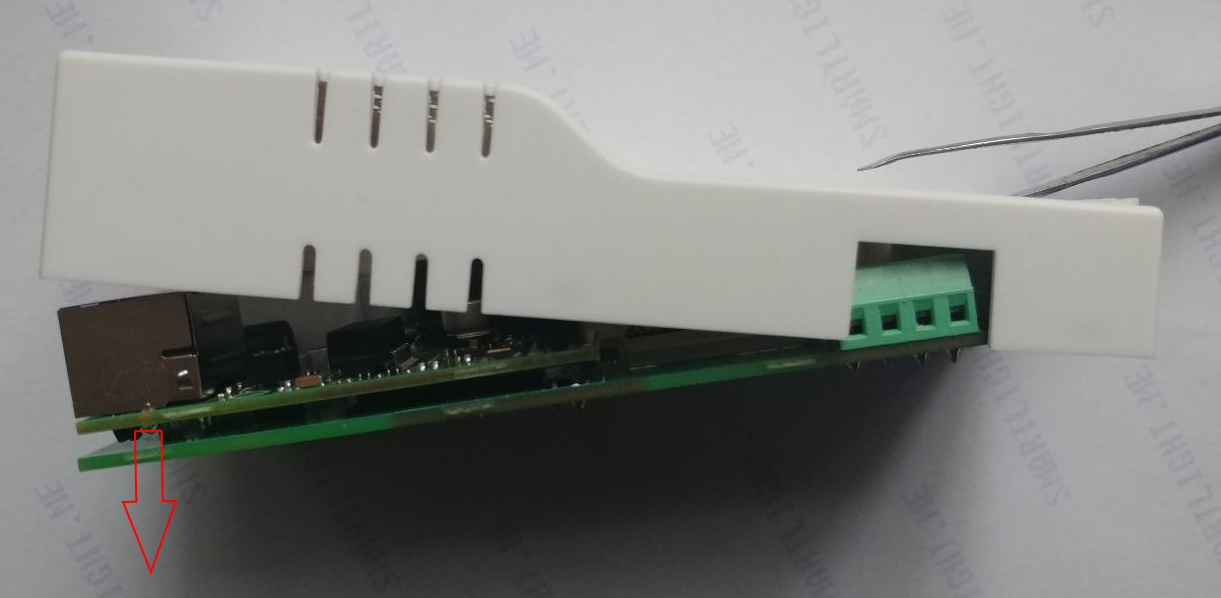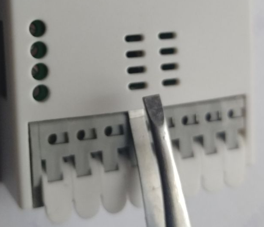 Use a thin and sharp tool for opening the device cover. Insert it into the center of the terminal connector as shown in the photo below: