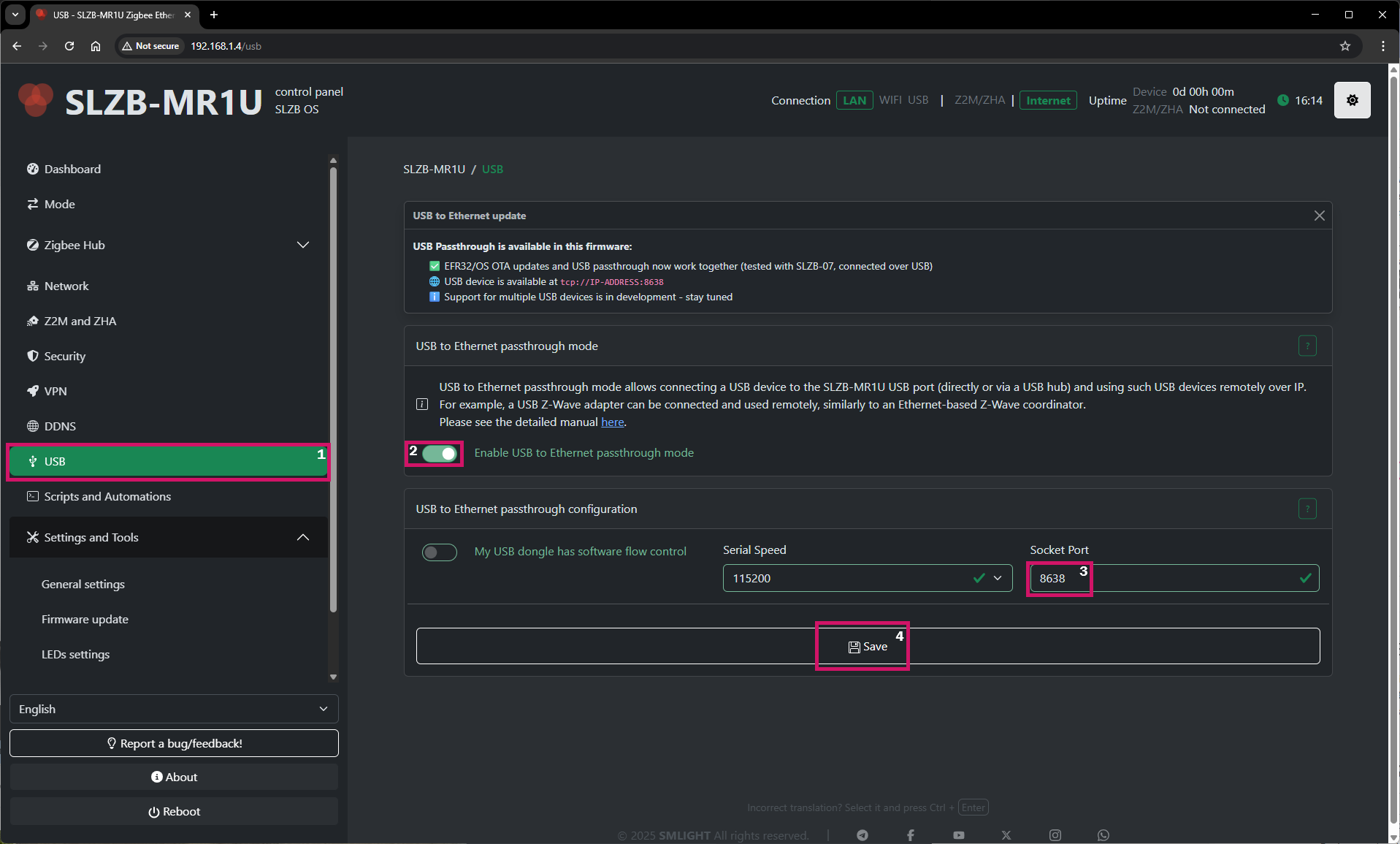 - Enable USB passthrough option (Go to http://slzb-mr1u.local/usb)