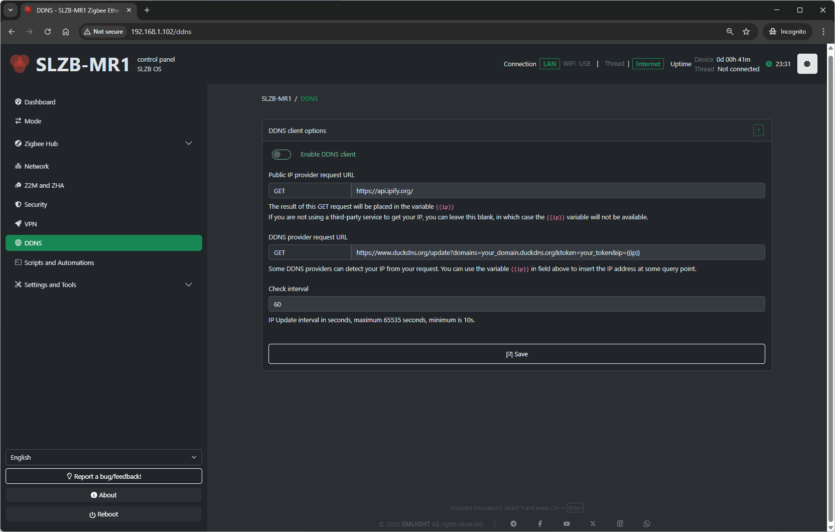 The DDNS page in SLZB-OS provides a helper to keep a public hostname updated with your device’s current public IP address. This is especially useful if your ISP changes your IP periodically and you want to access the coordinator remotely without manually tracking IP changes.