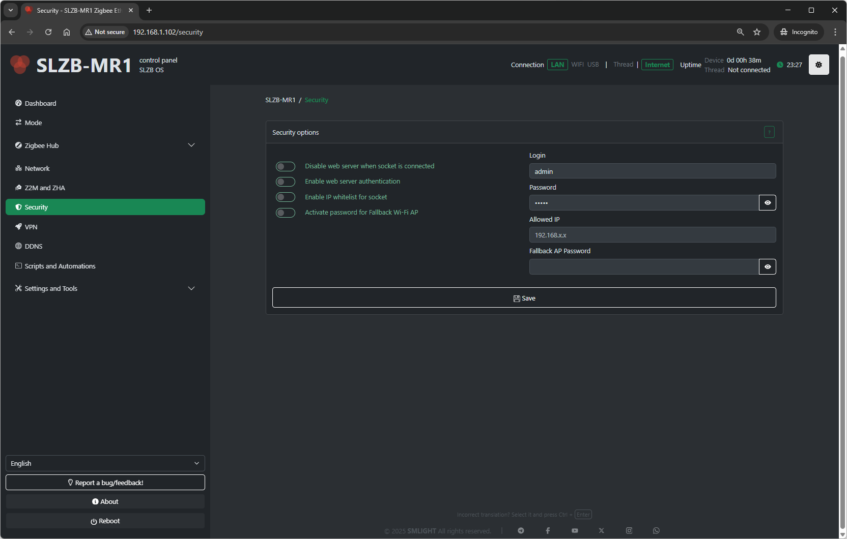 What it does: Enables login protection for the SLZB‑OS web interface.