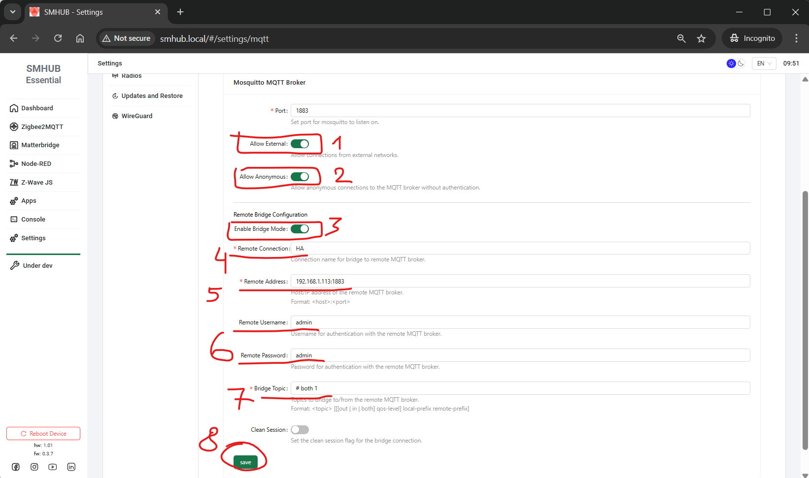 Allow External → Enabled. This lets the remote broker send MQTT messages to SMHUB's broker.