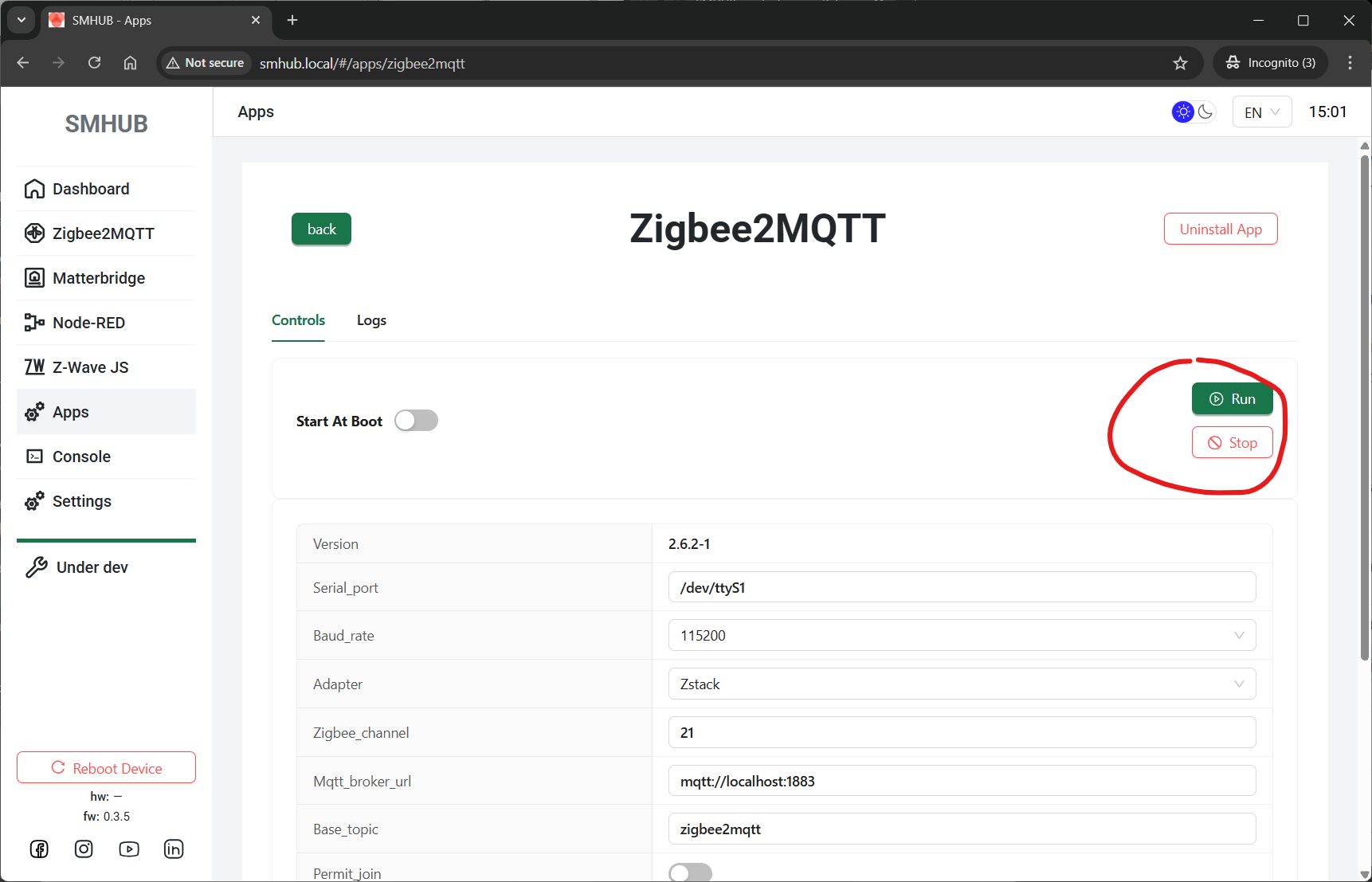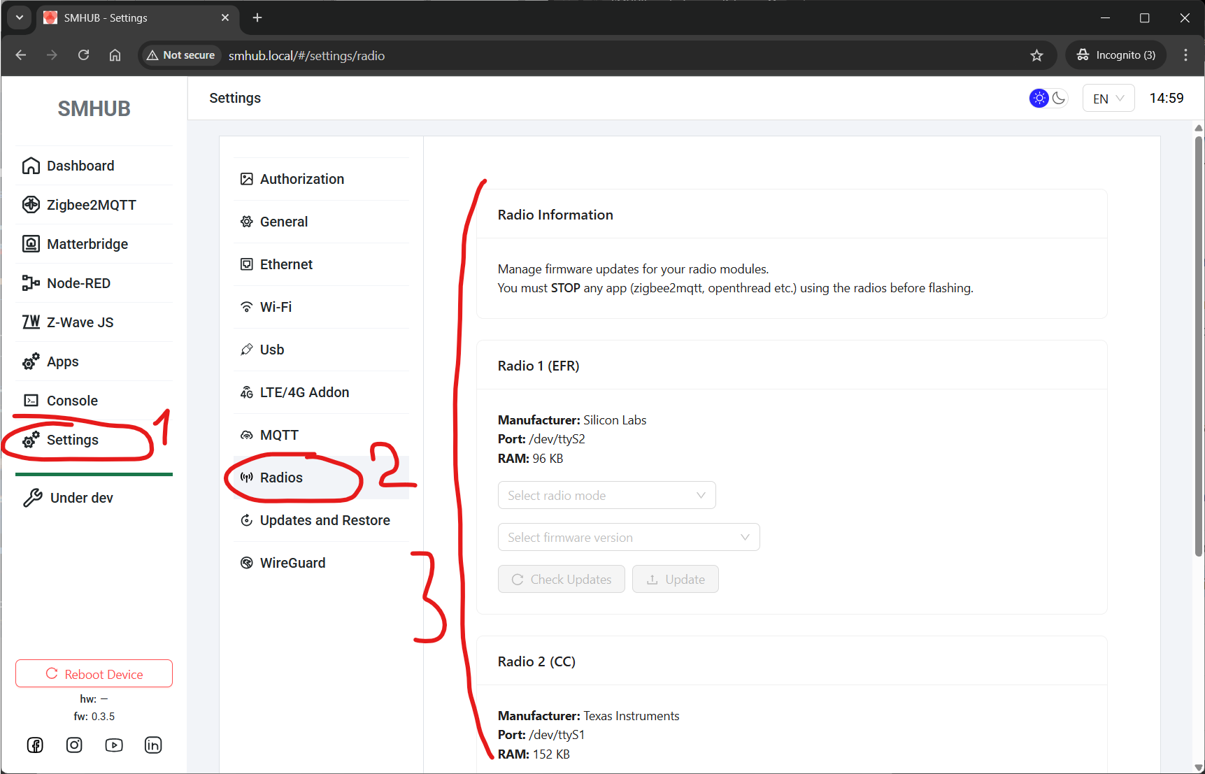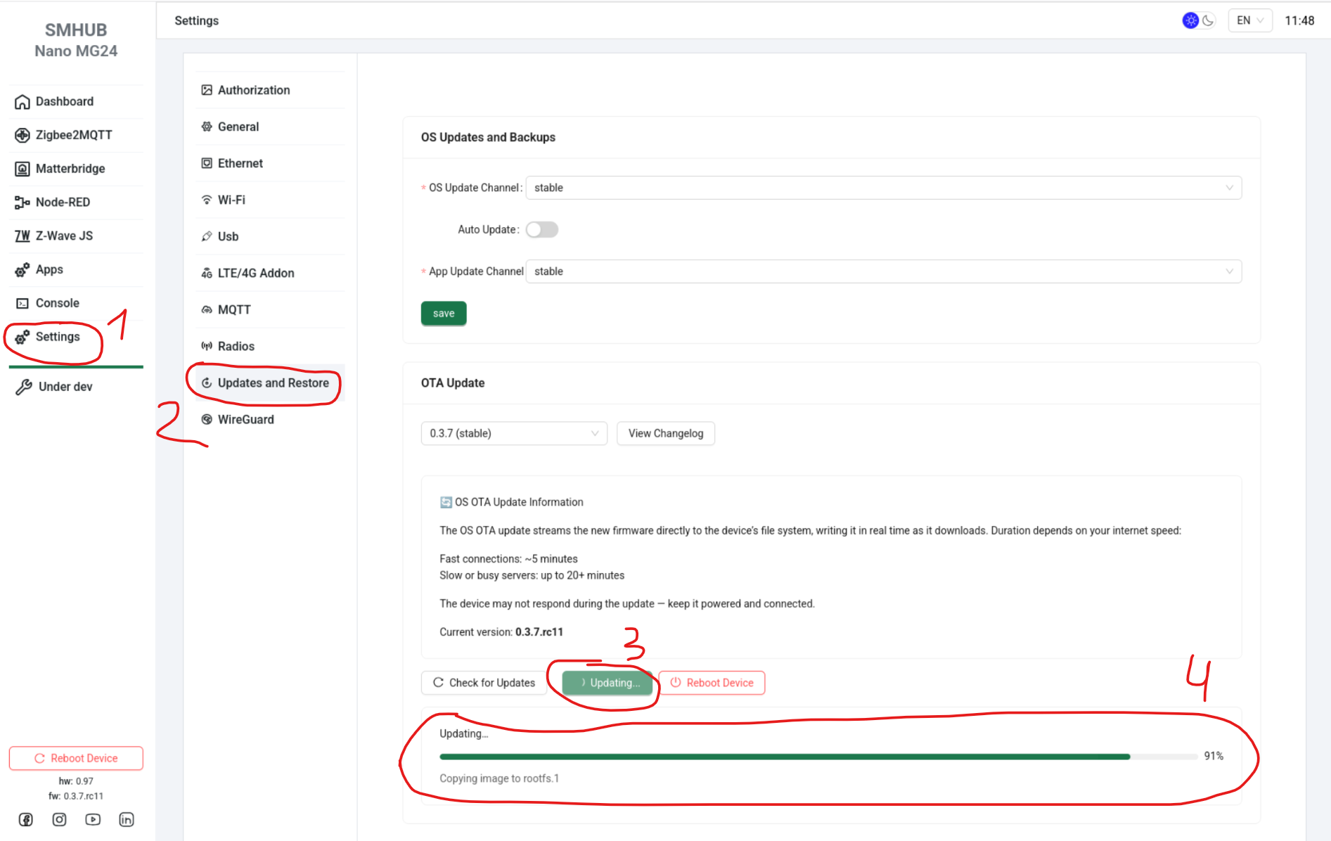 If you are running SMHUB-OS 0.2.1c - go to step 5. Otherwise, please update your SMHUB to SMHUB-OS v0.2.1c per this manual: https://smlight.tech/support/manuals/books/smhub/page/smhub-early-adopter-quick-start-guide#bkmrk-updating-smhub-firmw