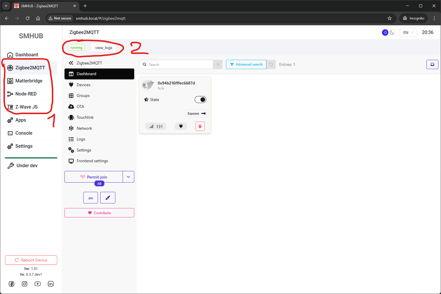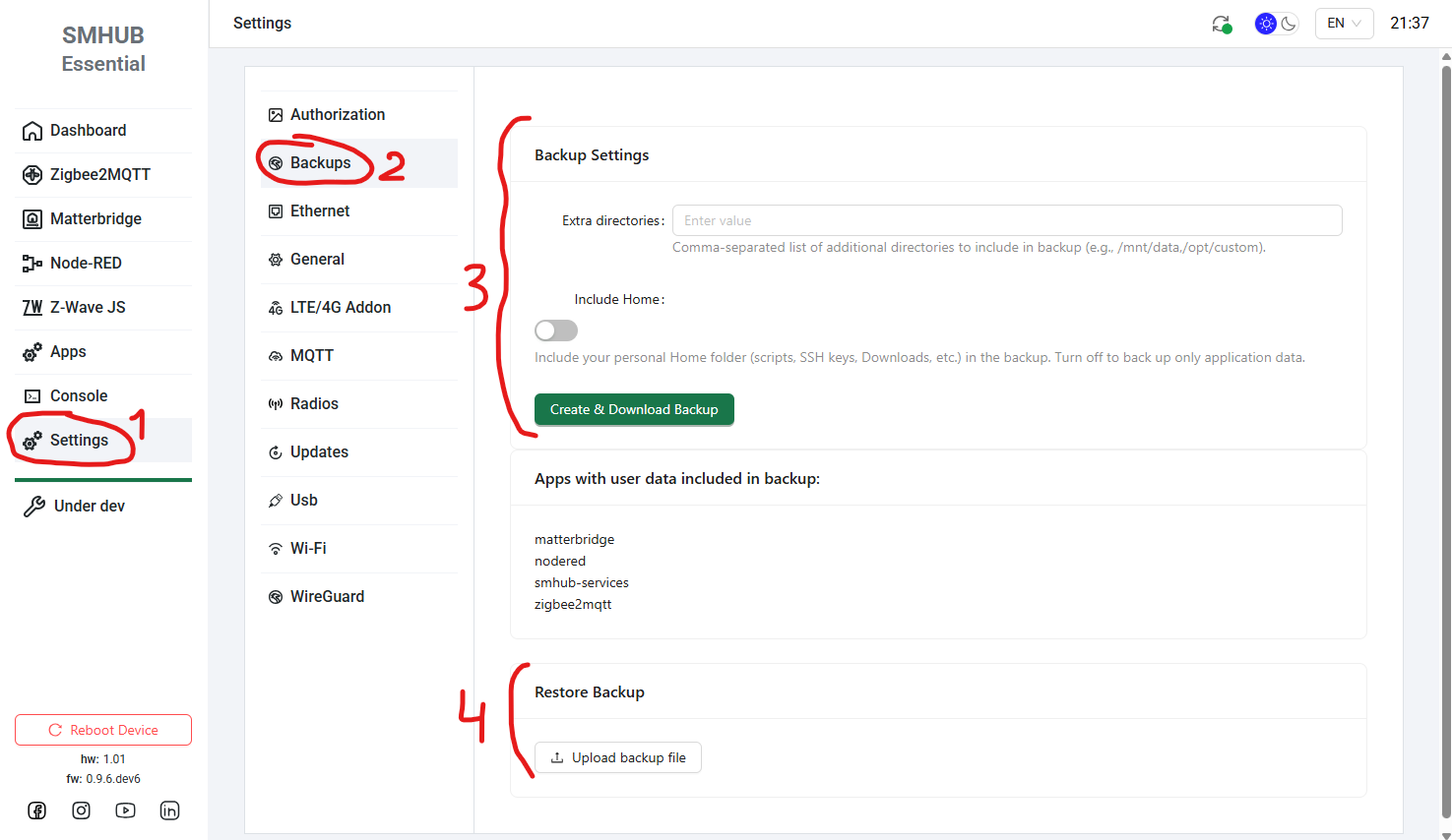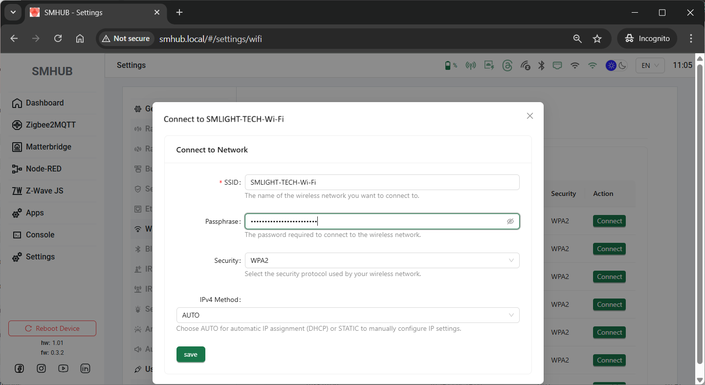 If you are running SMHUB-OS 0.2.1c - go to step 5. Otherwise, please update your SMHUB to SMHUB-OS v0.2.1c per this manual: https://smlight.tech/support/manuals/books/smhub/page/smhub-early-adopter-quick-start-guide#bkmrk-updating-smhub-firmw