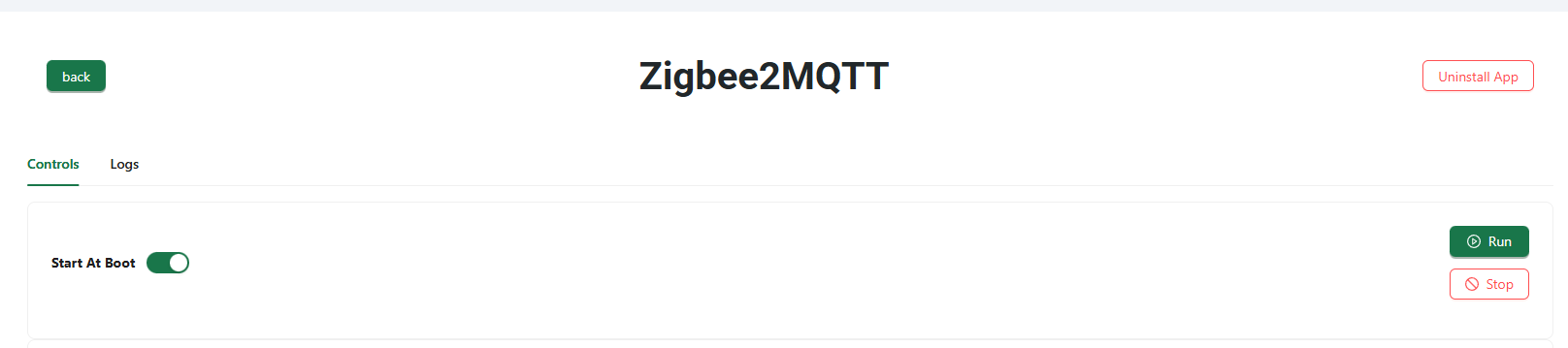6. Go to "Apps" -> "Zigbee2MQTT" and press "Run" button