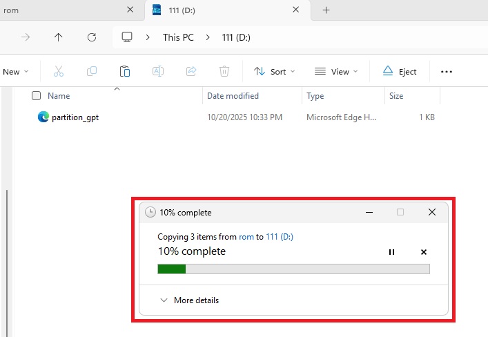 When copying finishes, right-click the SD card drive → Eject → remove the card.