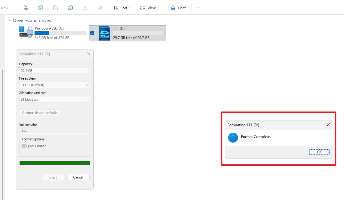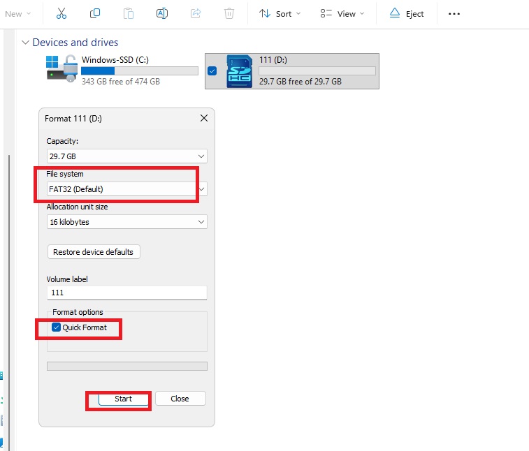 Tip: If your SD card is larger than 32 GB and FAT32 isn’t shown, try another (smaller) card. (Advanced users: a third-party FAT32 formatter also works.).