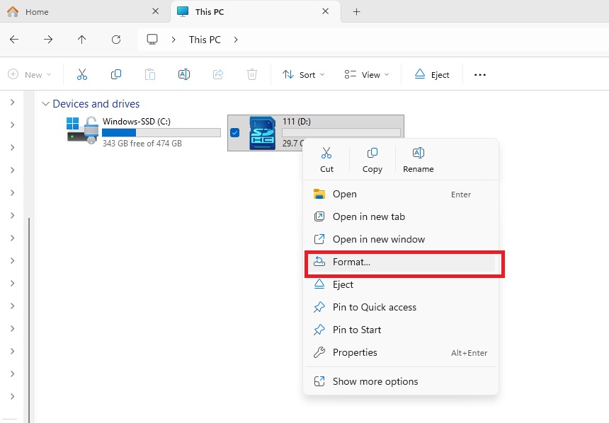Right-click the SD card drive (e.g., “SDHC (E:)”).